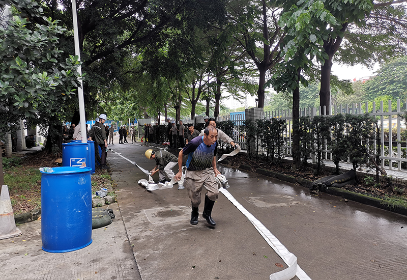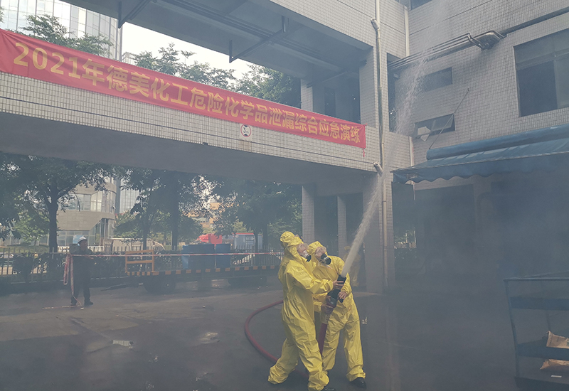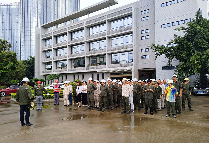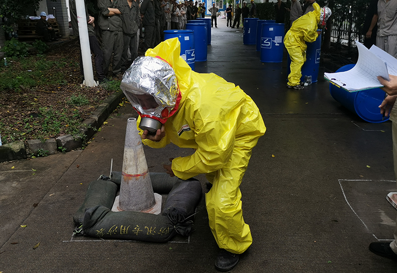 8月14日8点40分,对讲传来“老黄老黄,向小东和普志抽料时发生中毒晕倒了”,生产协助人员立即上班车间领导,随着车间人员的预警上报,正式拉开了应急演练的序幕。总指挥张总在接到警情下,启动了工厂综合应急预案,通知了控制室和保安室拉响警报,紧急疏散工作人员。各部门人员应声有序的到指定集合地点集合,各班组保持2米间距,班组负责人立即清点人数,汇报总指挥。总指挥收到信息后,立即向工厂应急人员下达抢险工作任务。医疗组、警戒组和抢险立即前往消防站穿戴防护用品和救援装备。同时指挥部领导立即对现场进行指挥救援。抢险组人员将中毒人员转移到安全区域,医疗组人员对伤员进行紧急救助,开展心肺复苏术,然后用应急车辆将伤员送往桂洲医院救治。同时应急抢险组人员立即赶赴事故区域,对泄漏源进行切断,扶起和转移包装桶。然后用应急沙袋对泄漏液进行围堵和吸附,减少泄漏的挥发和对环境的影响。然后立即连接消防水,采用喷淋枪头,对车间区域进行洒水,稀释清除空气中挥发和残留的有害原料。洒水结束后,立即对现场开展清净下水处置,收拾好事故现场,恢复至正常状态。在15分钟内完成了整个演练过程的所有工作。